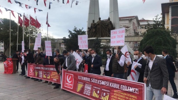 Milliyetçi ve İslamcı Yeniden Refah Partisi’nden bir grup erkek, Ekim 2020’de, İstanbul Sözleşmesi’ne karşı eylem yaptı. https://www.istiklal.com.tr/haber/yeniden-refah-partisinden-istanbul-sozlesmesi-aciklamasi/581168