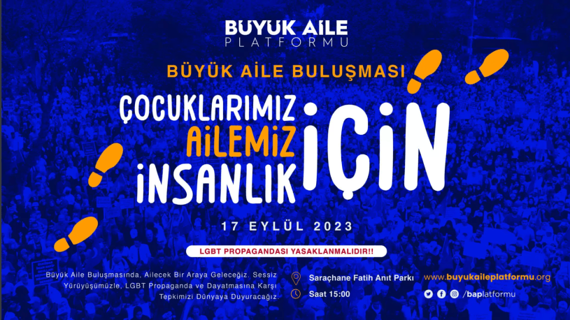 Türkiye’de toplumsal cinsiyet karşıtı hareketin yansımalarından biri olan “Büyük Aile Buluşması”nın ikincisi 17 Eylül’de İstanbul’daki Saraçhane meydanında Büyük Aile Platformu’nun organizasyonuyla gerçekleşti. “Çocuklarımız için, ailemiz için, insanlık için” ve “LGBT propagandası yasaklanmalıdır” sloganlarıyla duyurulan toplantıda yine bol bol LGBTİ+ ve kadın hakları karşıtı, hepsi tek kalemden ve yazıcıdan çıkmışa benzeyen pankartlar vardı. Katılım beklenenden azdı fakat katılanların verdikleri röportajlarda dile getirdiği komplo teorisine varan iddialar hayli ilginçti.
